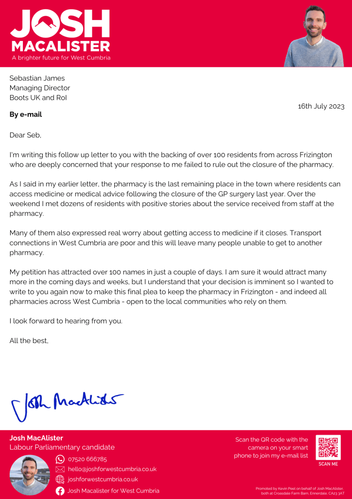 Following reports that Boots are planning to close 300 stores across the country, with a focus on pharmacies, I wrote to Boots and launched a petition calling on them to protect stores in west Cumbria.