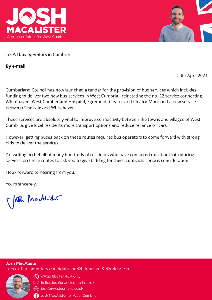 Josh MacAlister, Labour’s Parliamentary candidate for Whitehaven and Workinton, has written to all bus operators in Cumbria calling on them to step up and deliver new bus services.