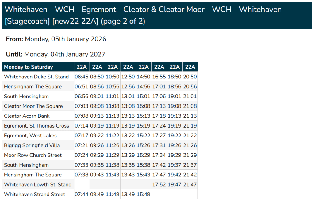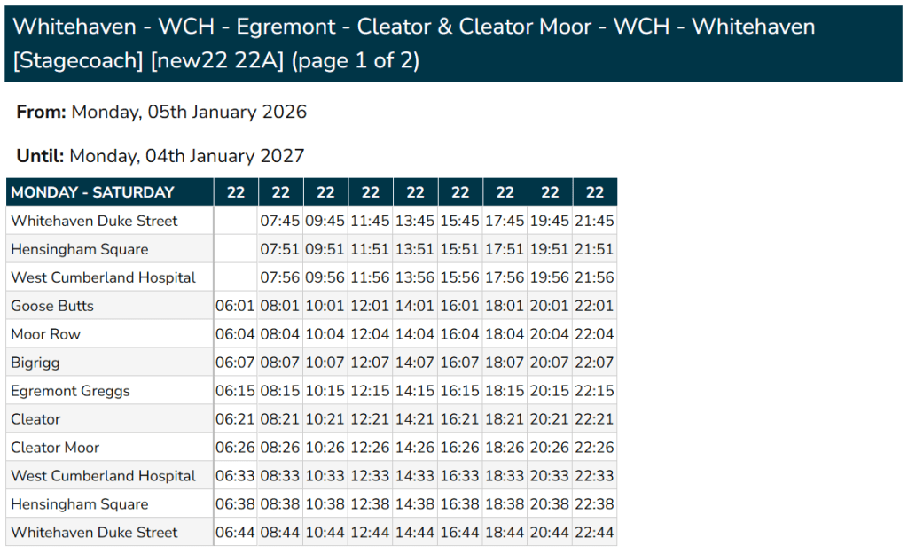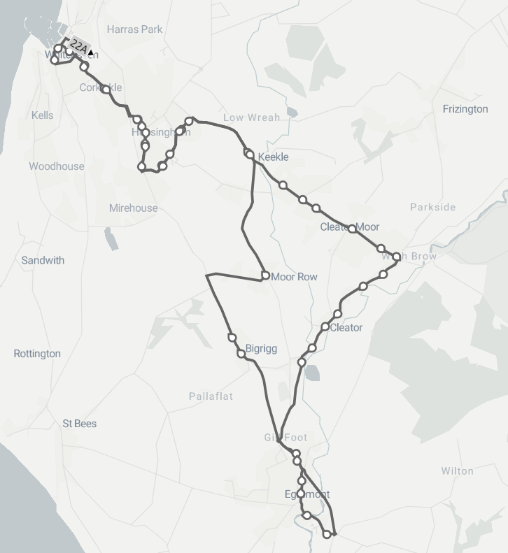 🚏 22/22A – Whitehaven – Hensingham – West Cumberland Hospital – Goose Butts – Moor Row – Bigrigg – Egremont – Cleator – Cleator Moor – West Cumberland Hospital – Hensingham – Whitehaven