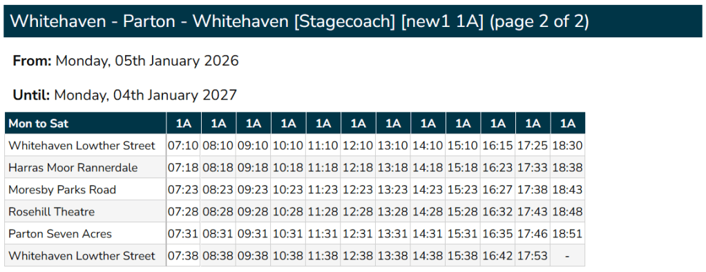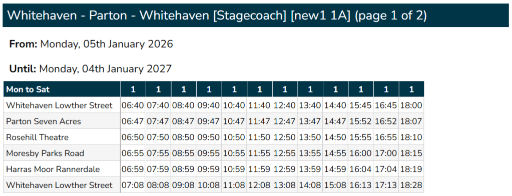 🚏 1/1A – Whitehaven – Bransty – Parton – Rosehill Theatre – Moresby Parks – Whitehaven