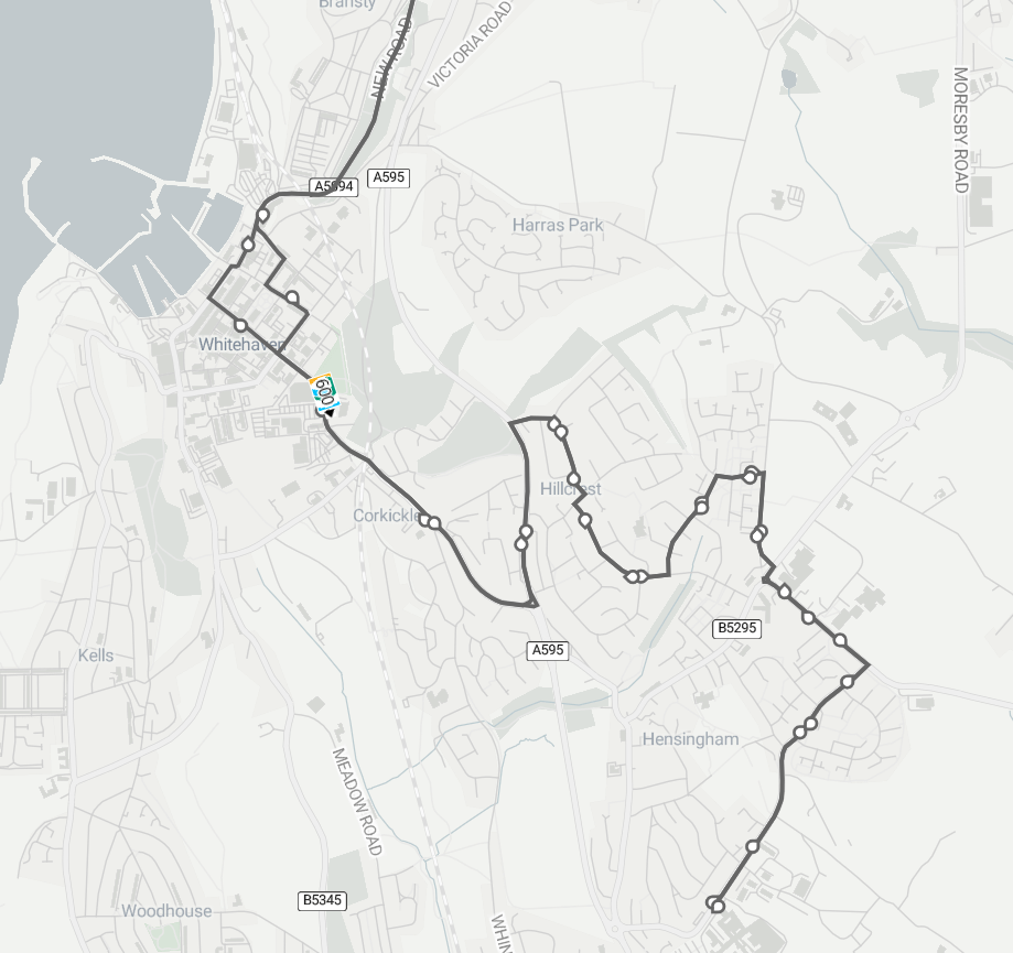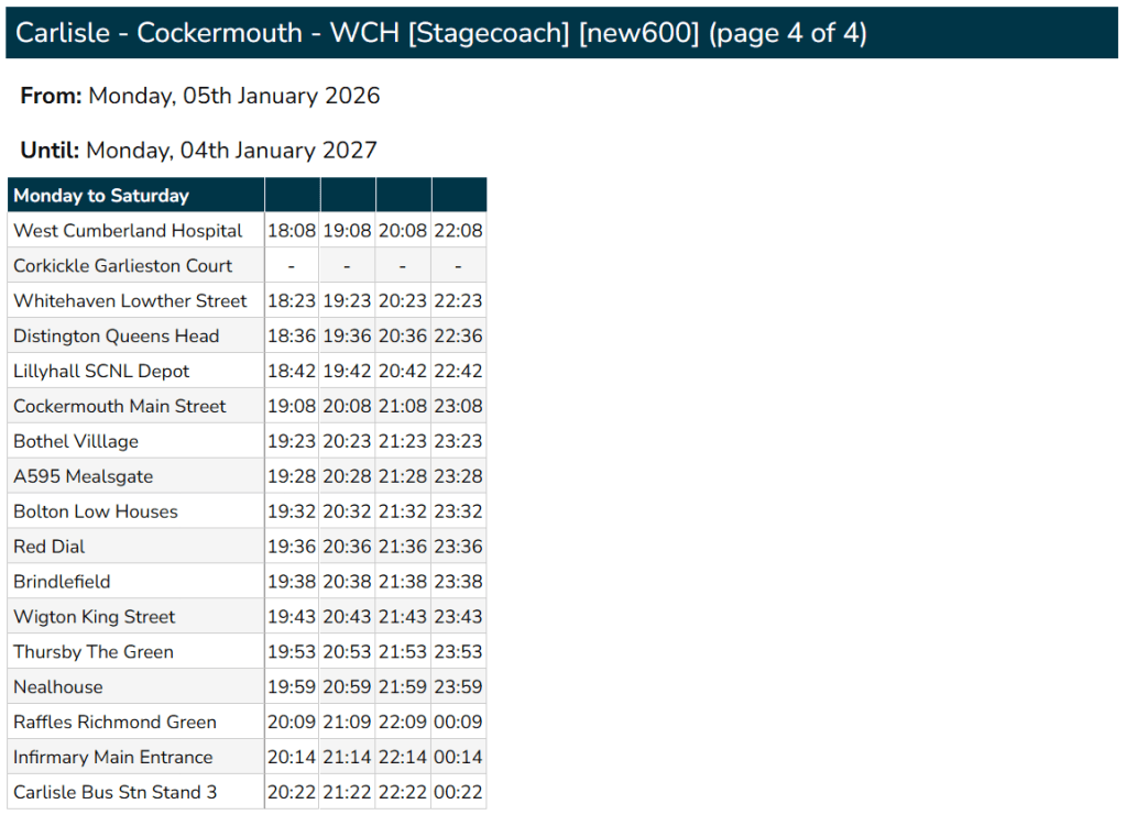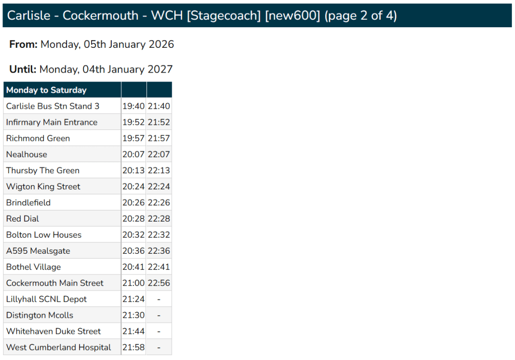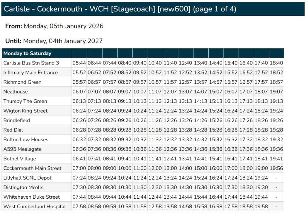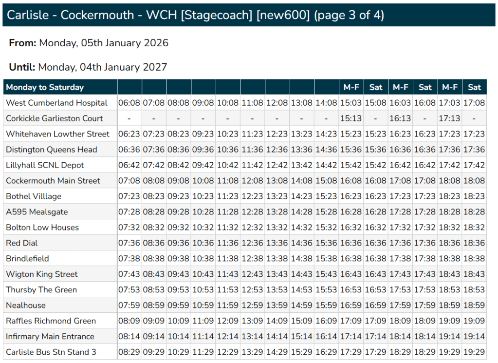 🚏 600 – West Cumberland Hospital – Whitehaven – Parton (A595) – Distington – Lillyhall – Bridgefoot – Cockermouth and onwards to Cumberland Infirmary and Carlisle