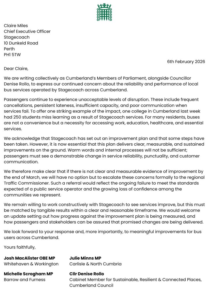This follows the £5 million already secured in 2025 which is delivering a number of new bus services and a programme of bus stop upgrades across West Cumbria and beyond. You can find out more about the new services in our area here: joshmacalister.uk/backthebus