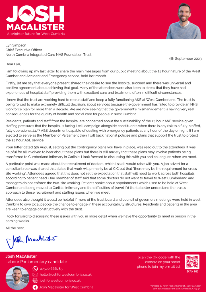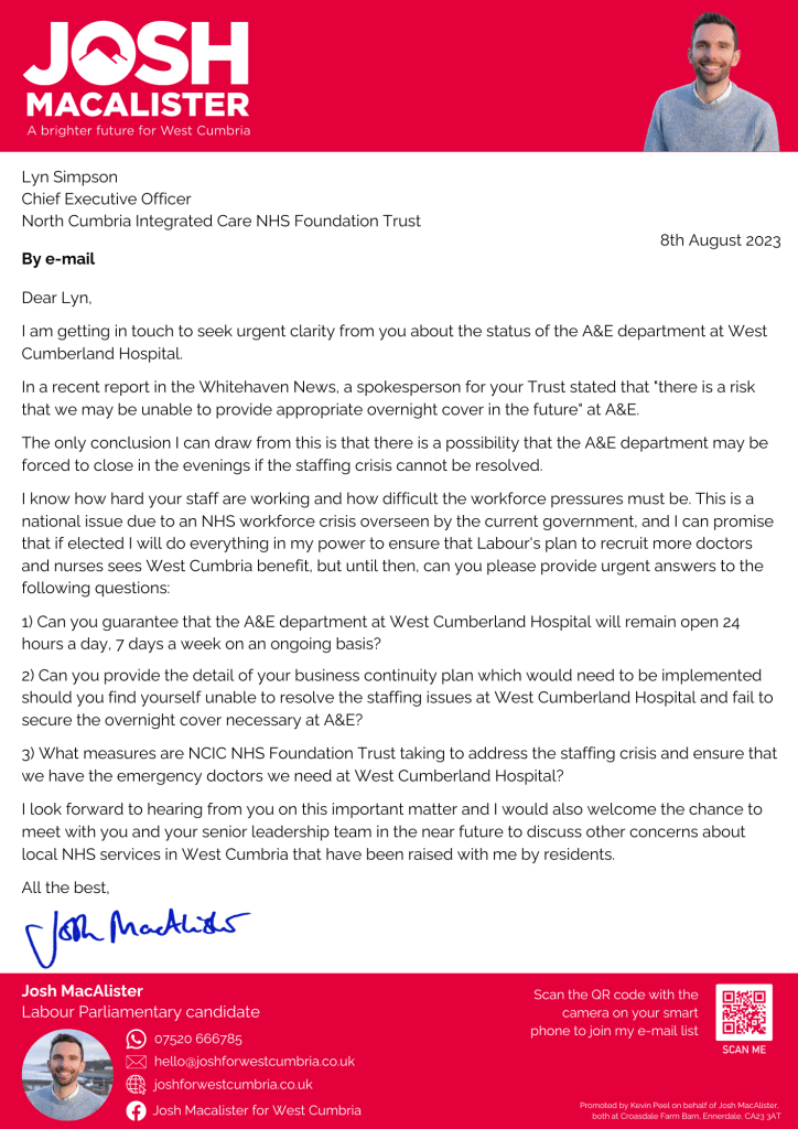 I know that the trust are doing everything they can to recruit staff and keep a fully functioning A&E at West Cumberland. They’re being forced to make extremely difficult decisions about services because the government failed to provide an NHS workforce plan for more than a decade. The government’s mismanagement is having very real consequences for the quality of health and social care for people in West Cumbria.