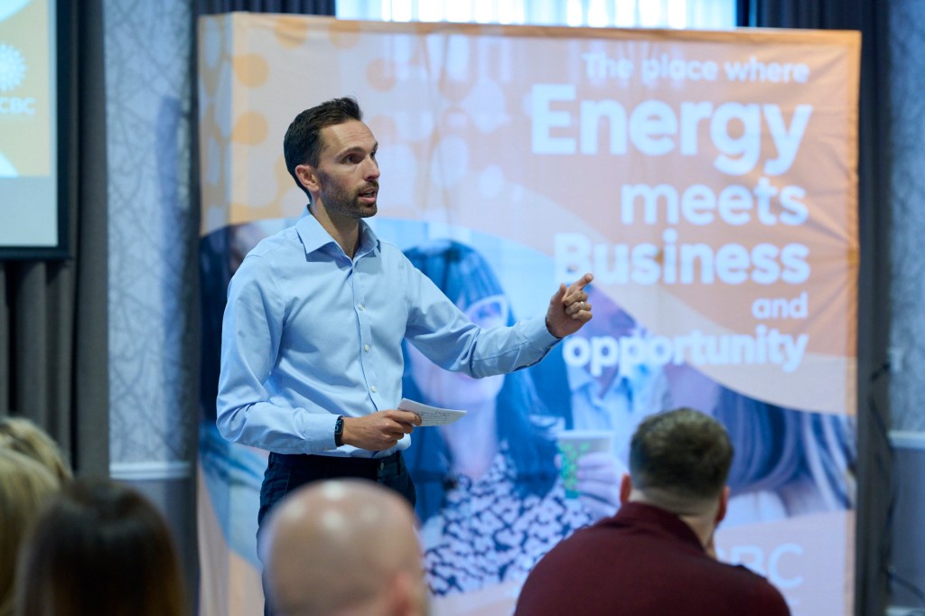 Josh speaking at a BECBC energy event to promote the plan for Pioneer Park